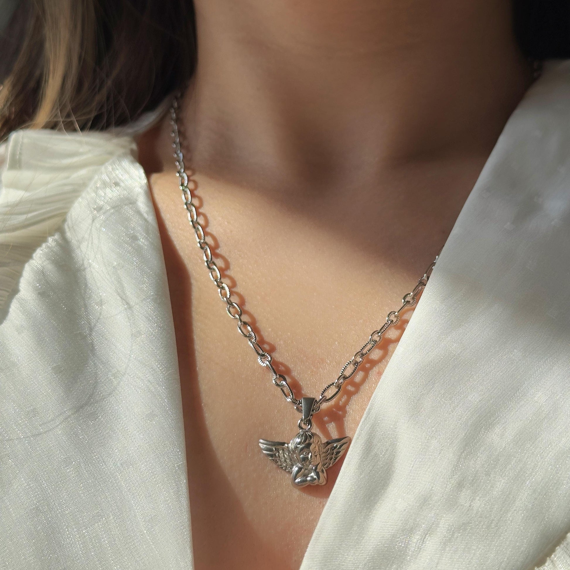 Add a celestial touch to your jewelry collection with this angel pendant necklace, featuring a delicate winged cherub and distinctive chain designs in gold and silver options. Perfect for those who love elegant yet meaningful accessories.