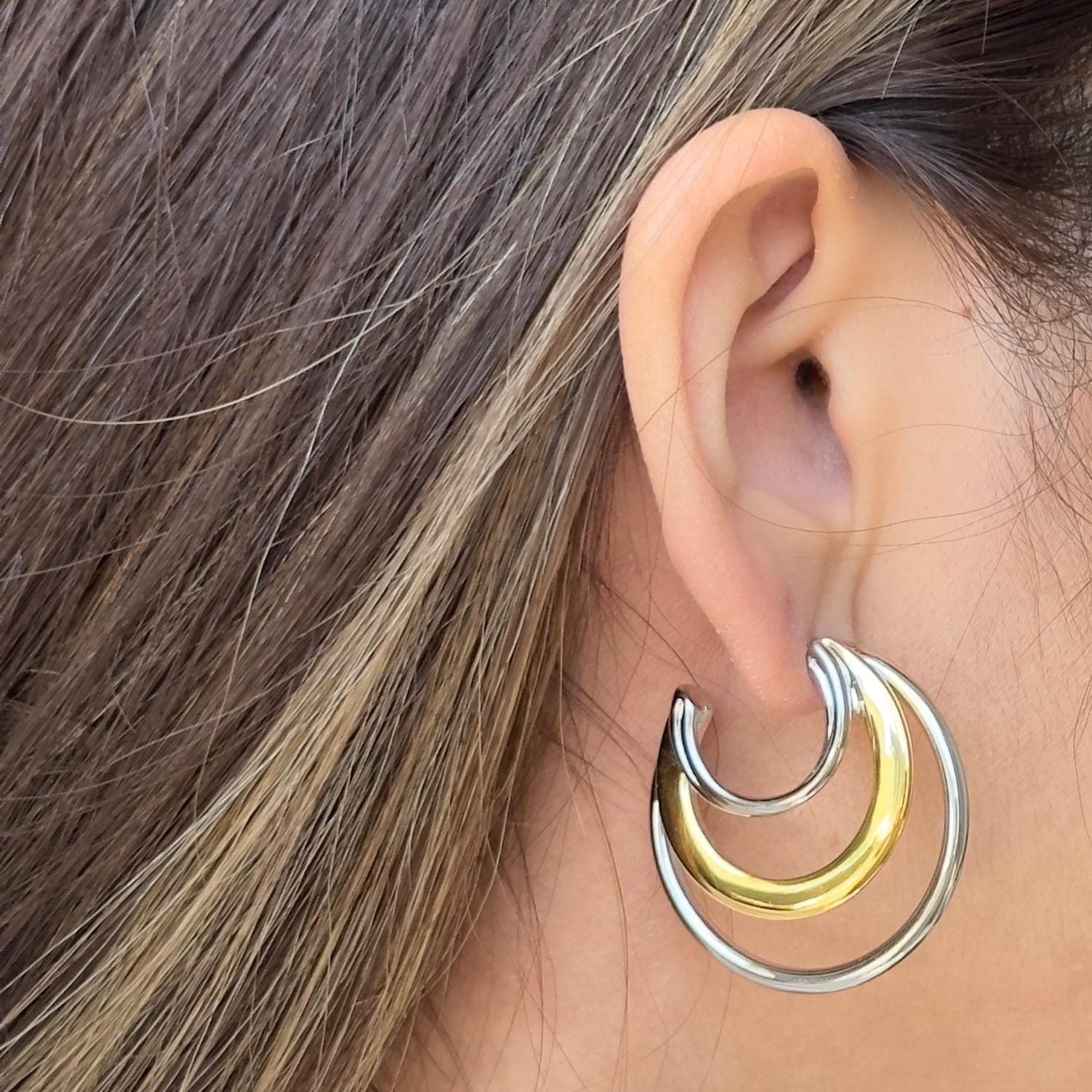 Chunky Gold Silver Hoop Earrings, Triple Layer Statement Circle Earrings, Geometric Bold Earrings for Women, Two Tone Retro Metal Jewelry
