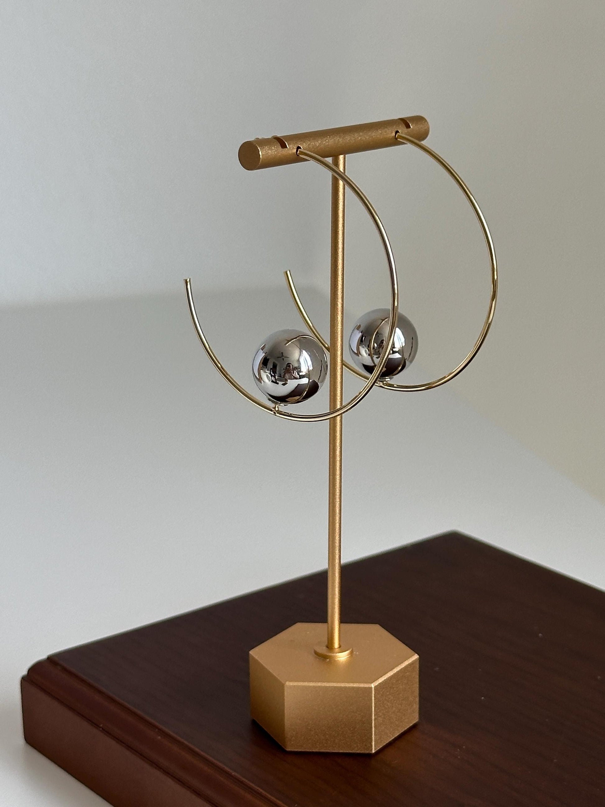 Elevate your style with these stunning minimalist geometric hoop earrings. Crafted with a sleek gold-tone finish and adorned with a striking silver sphere, these earrings blend contemporary elegance with timeless charm.