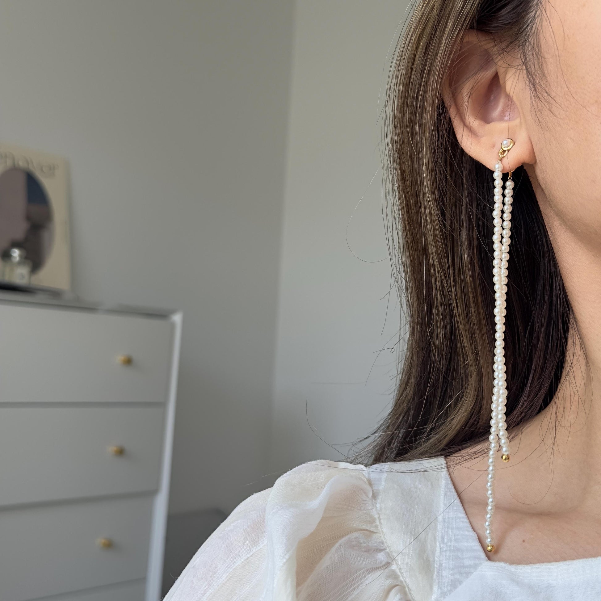 Add a touch of grace and sophistication with these stunning pearl dangle earrings. Designed with delicate multi-strand pearls cascading from a gold accent stud, these earrings exude timeless elegance and modern charm.