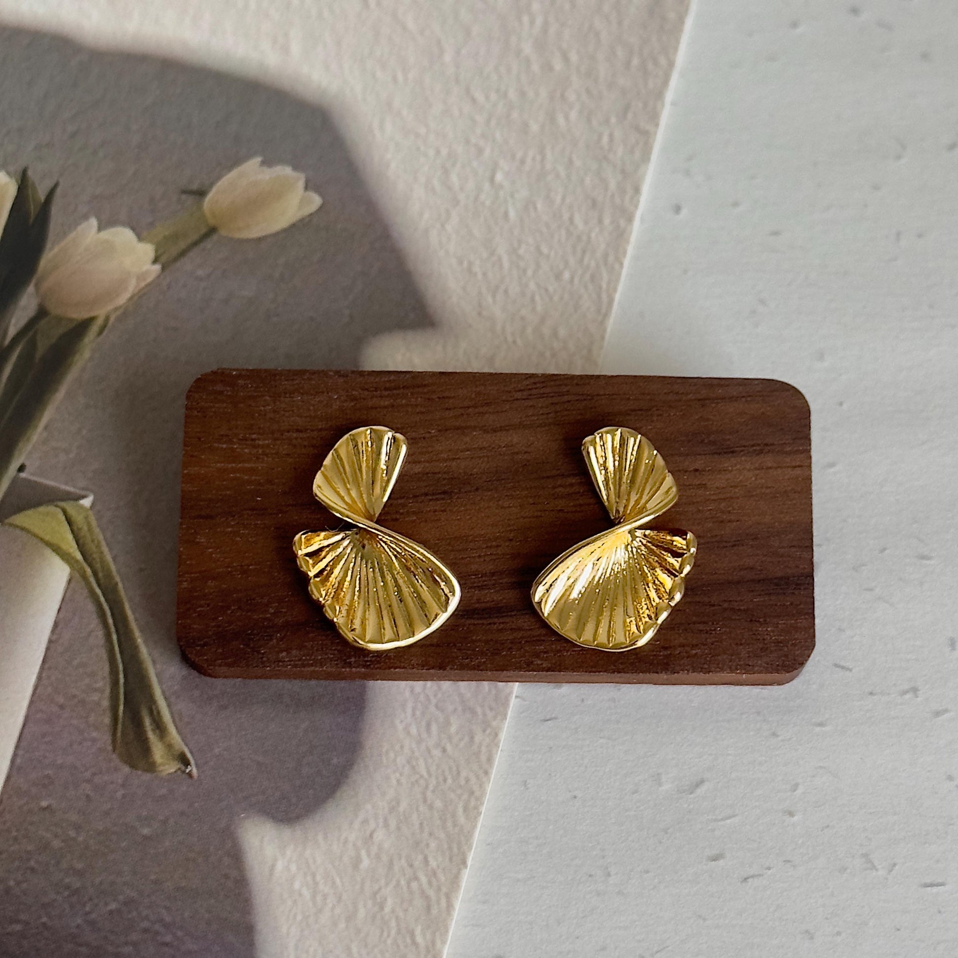 Gold Shell Design Earrings, Twisted Fan Shape Stud Earrings, Sculptural Metal Earrings, Modern Geometric Gold Earrings, Gift for Her
