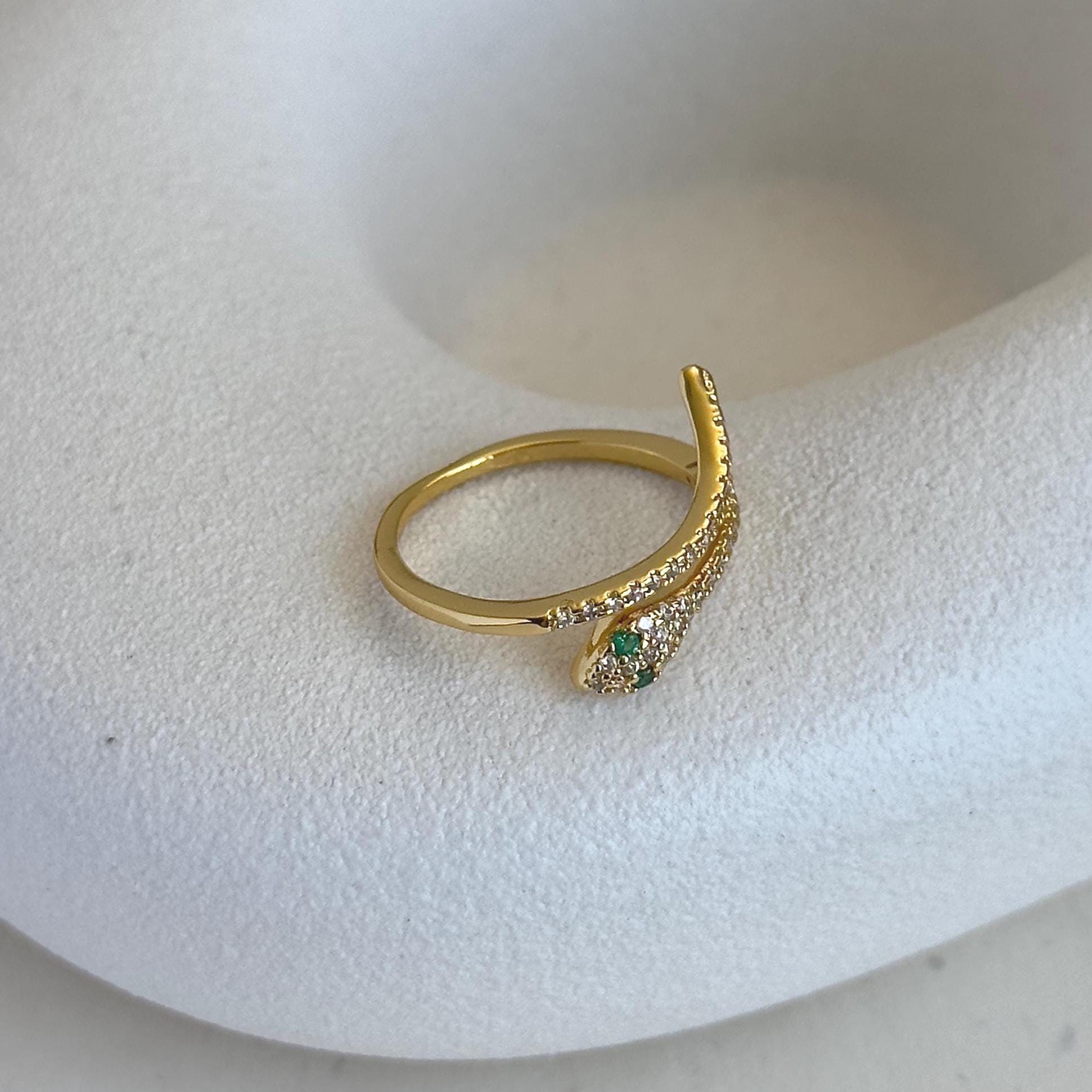 Unleash your inner power with this bold and elegant gold snake ring. Designed in a sleek serpent shape, this open wrap ring features shimmering pave-set cubic zirconia and striking green crystal eyes, capturing the allure and mystery of the snake symbol.