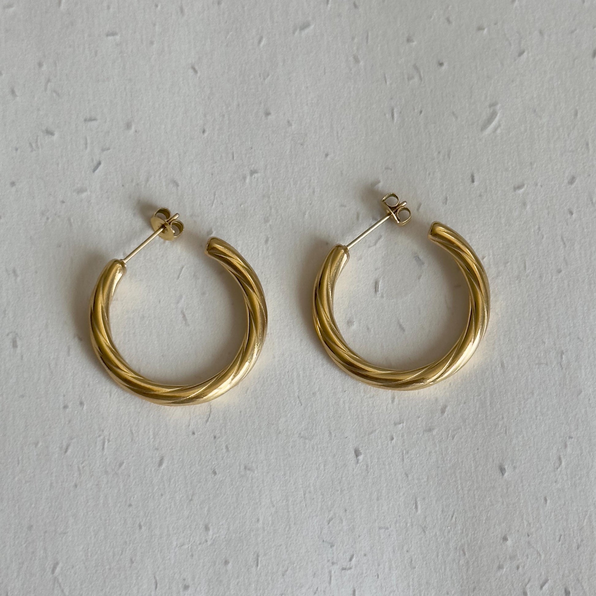 Add timeless elegance to your jewelry collection with these twisted gold hoop earrings. Featuring a subtle spiral design and a medium-sized silhouette, these hoops are perfect for everyday wear or dressing up your evening look. Their polished gold-plated finish adds a luxurious shine, while the lightweight design ensures comfort all day long.