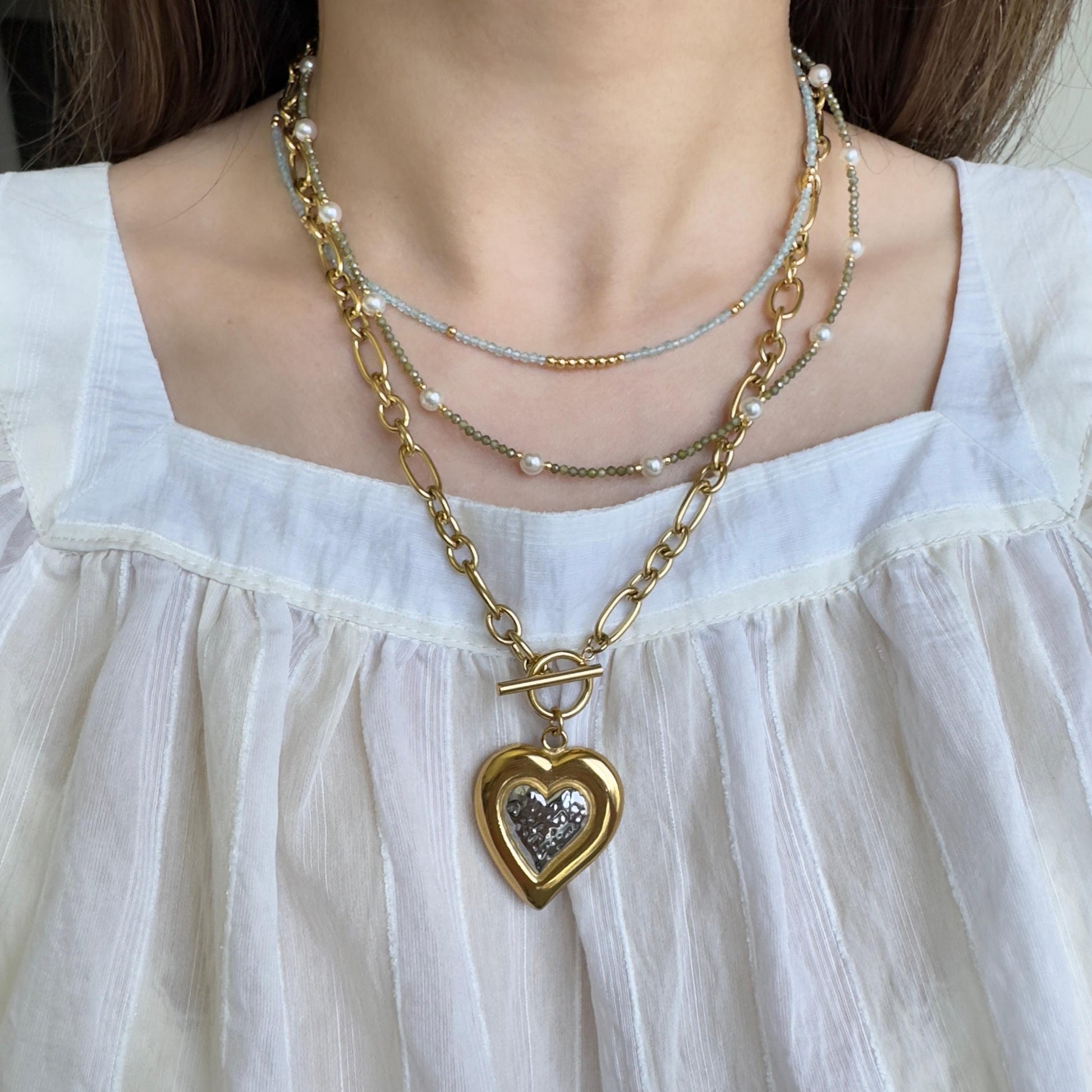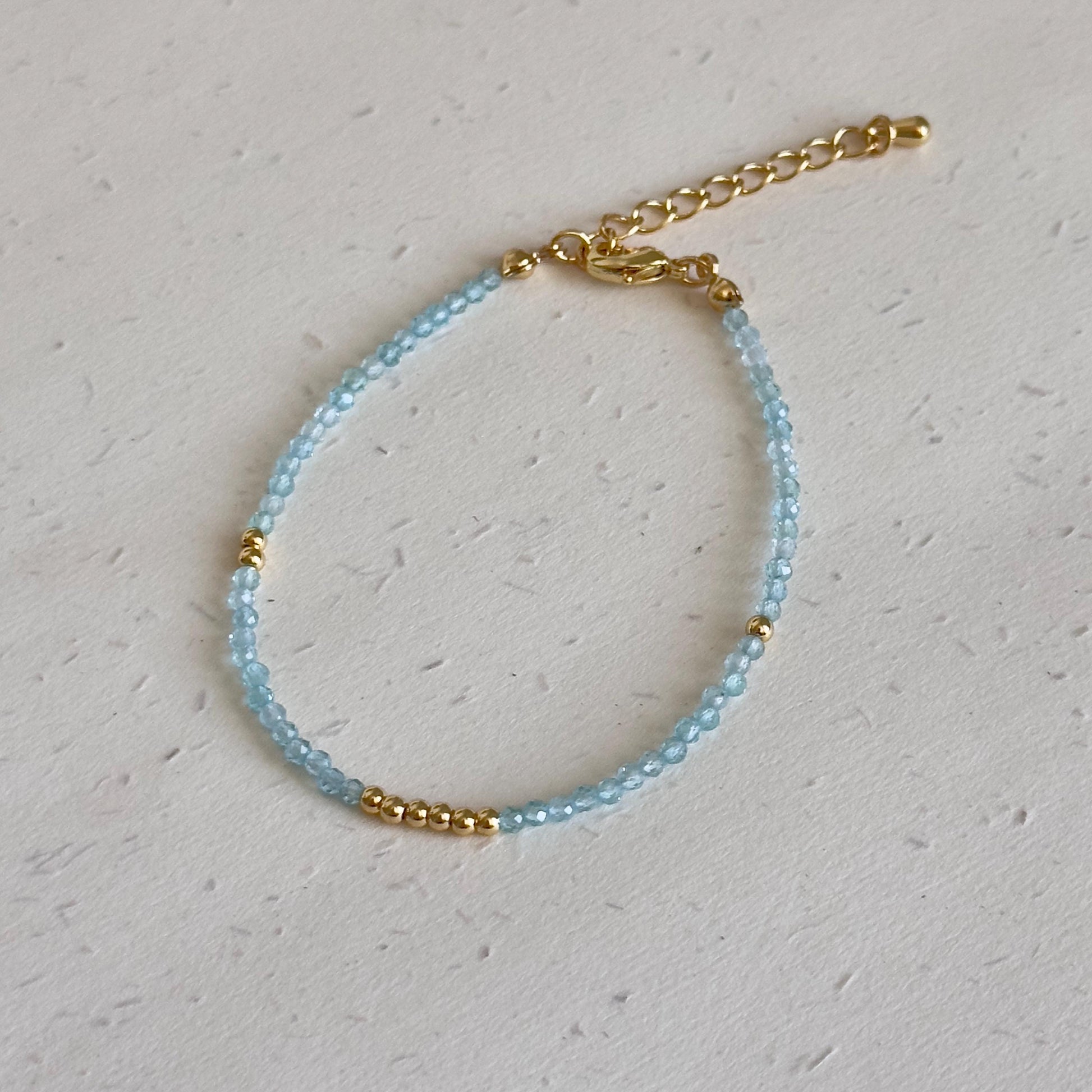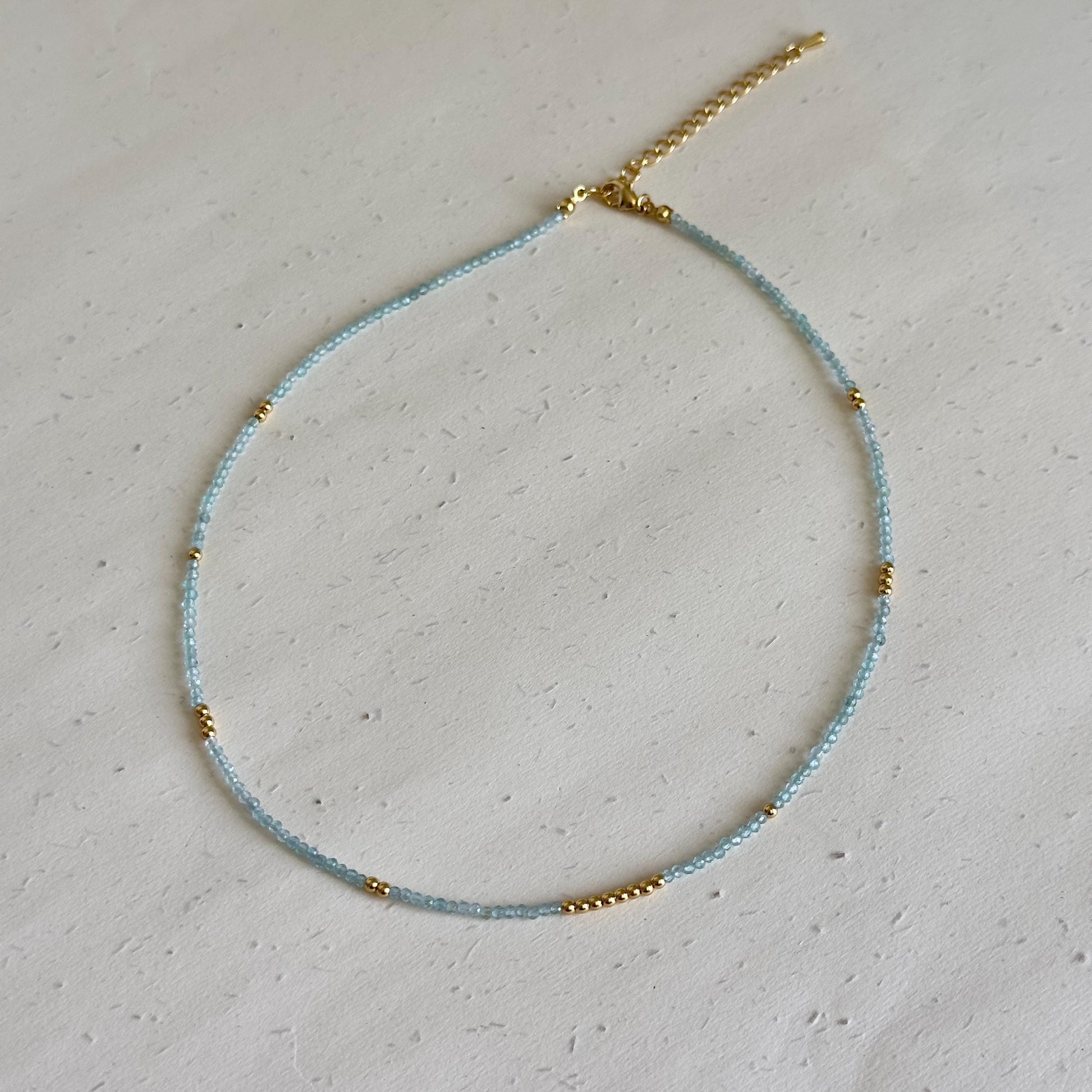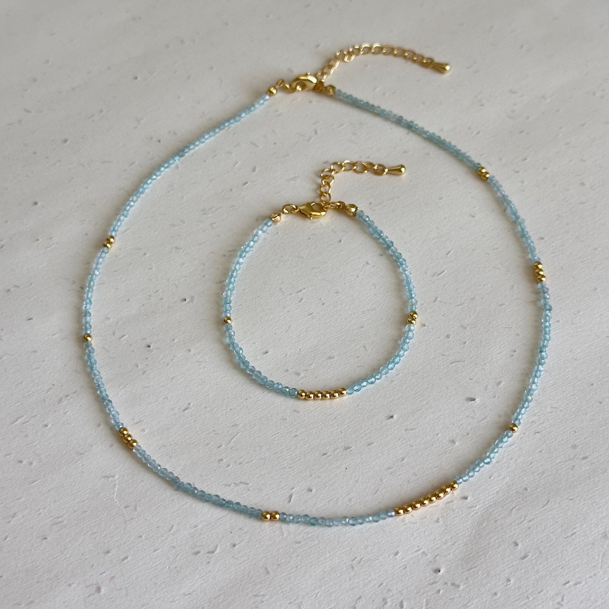 This matching necklace and bracelet set is made with 100% natural aquamarine gemstones, known for their beautiful light blue hue and calming energy. Each faceted bead is carefully strung and separated with small gold-plated accents, adding a refined touch to the delicate design.
