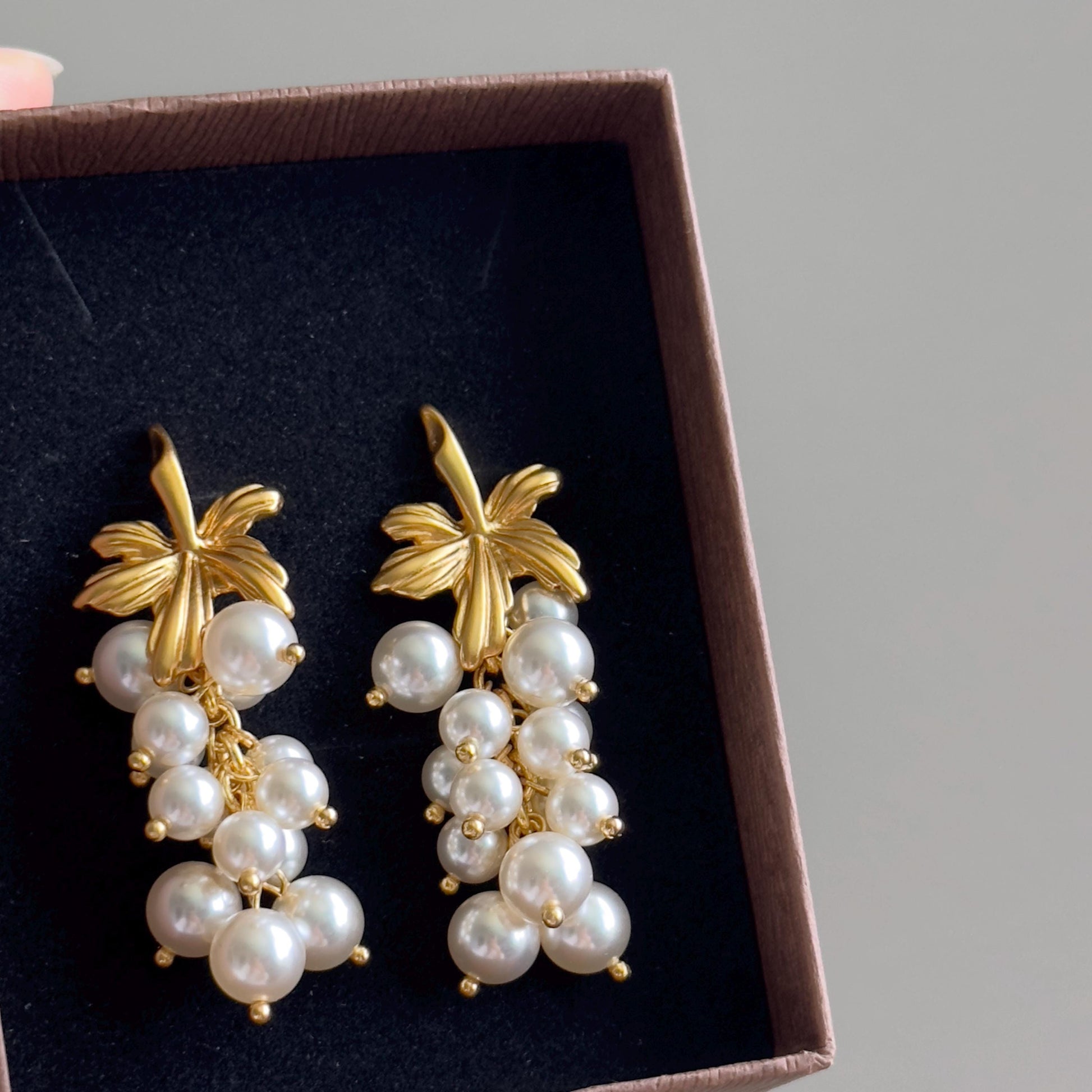 Pearl Cluster Earrings with Gold Leaf Top, Grape-Inspired Pearl Drop Earrings, Faux Pearl Dangle Earrings, Bold Bridal Pearl Earrings