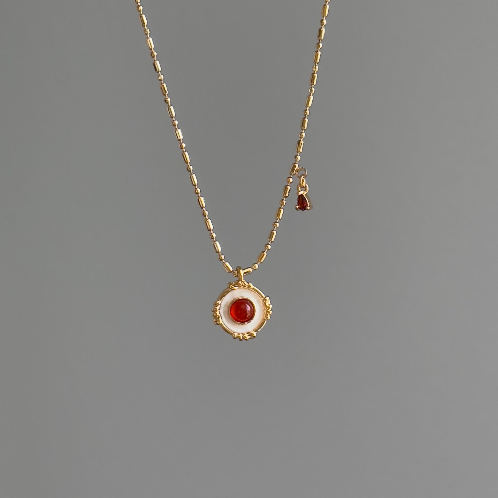 This dainty pendant necklace features a warm-toned red gemstone set in a round mother of pearl shell disc, framed by a vintage-style textured bezel. The pendant hangs from a delicate gold-plated brass box chain, finished with a matching red teardrop charm near the clasp for a thoughtful detail.