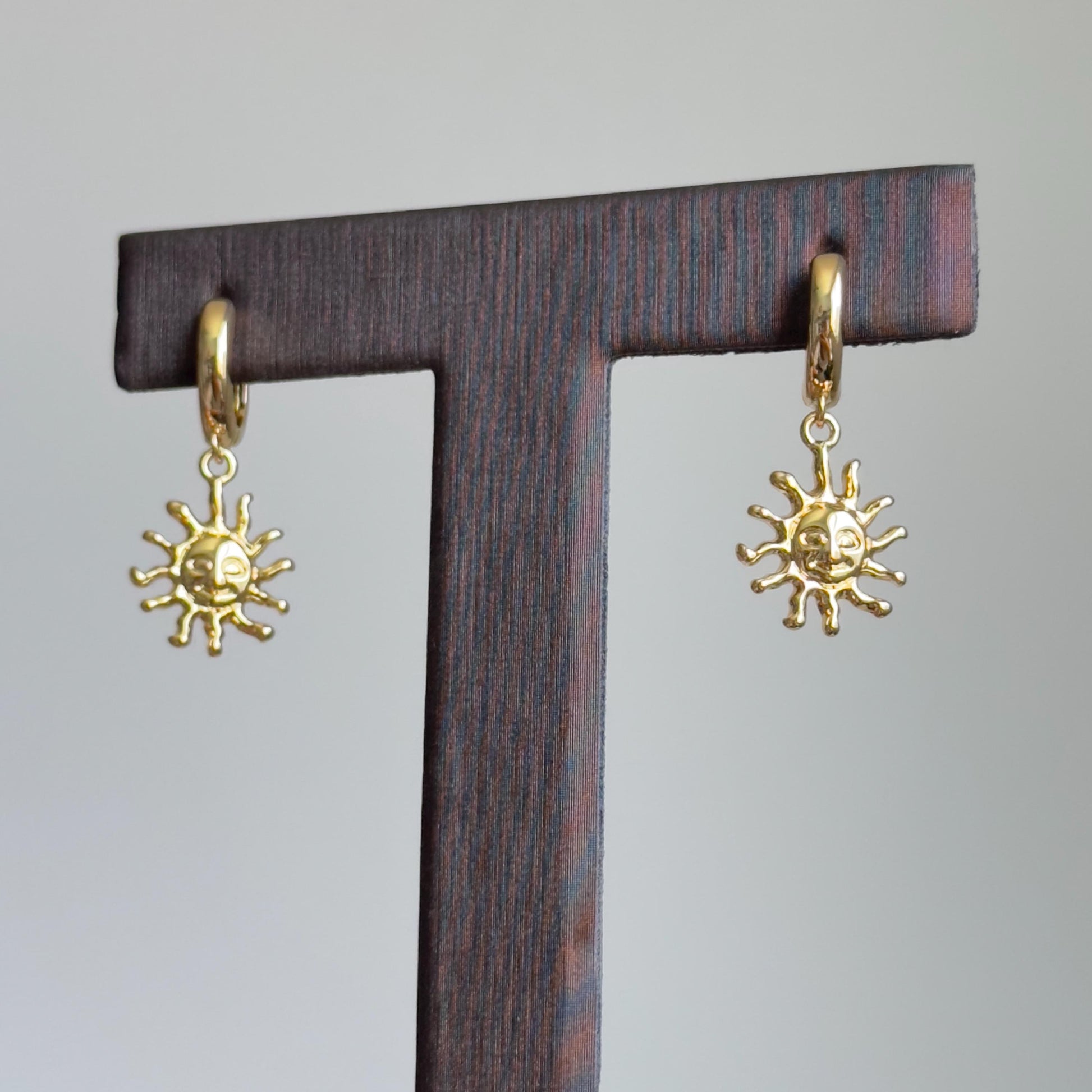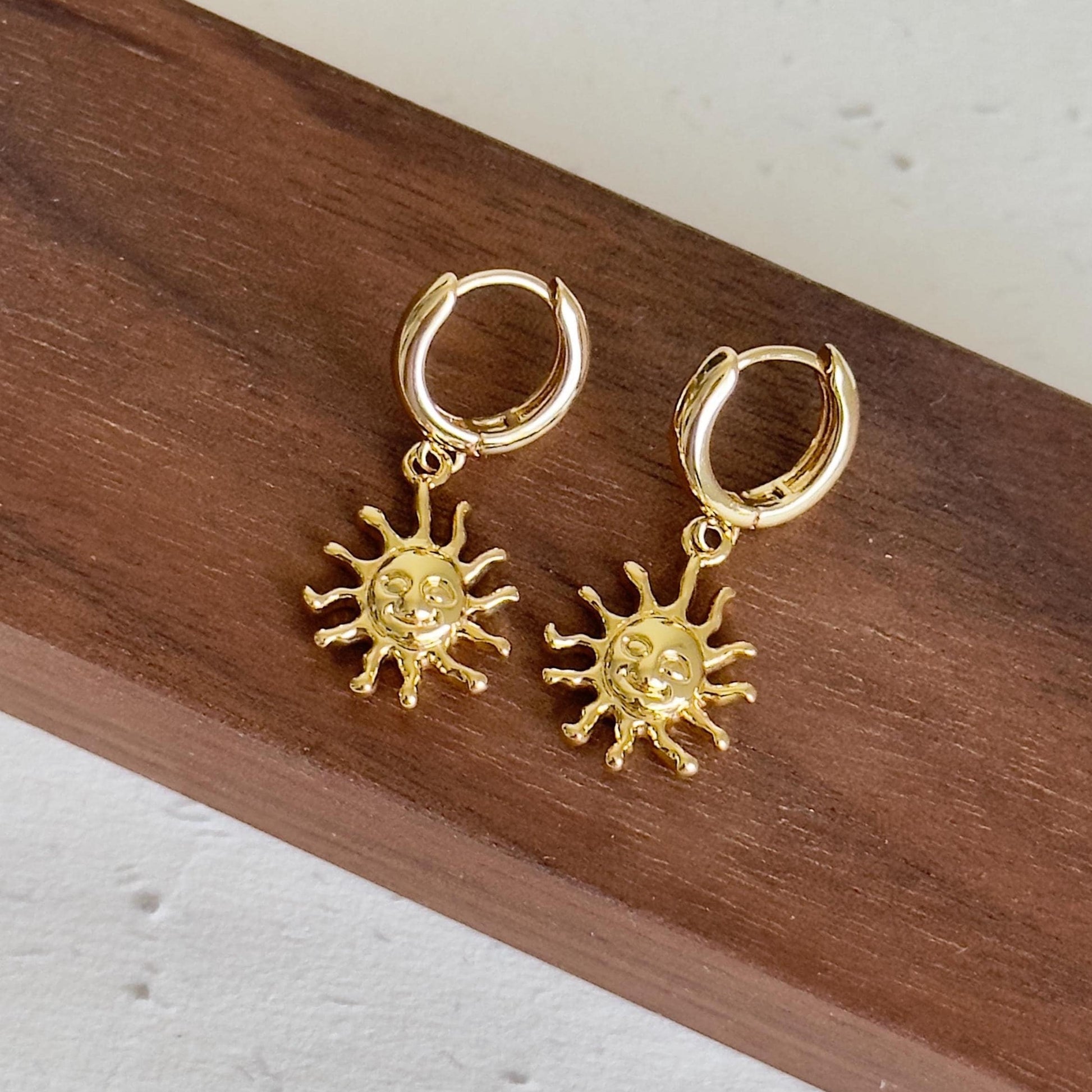 Radiate warmth and charm with these smiley sun dangle earrings. Featuring a gold-plated sun charm with a cheerful, vintage-style face, these hoops bring a playful yet retro celestial vibe to your look. The mini hoop design keeps them lightweight and comfortable, while the dangling sun adds movement and shine with every step.