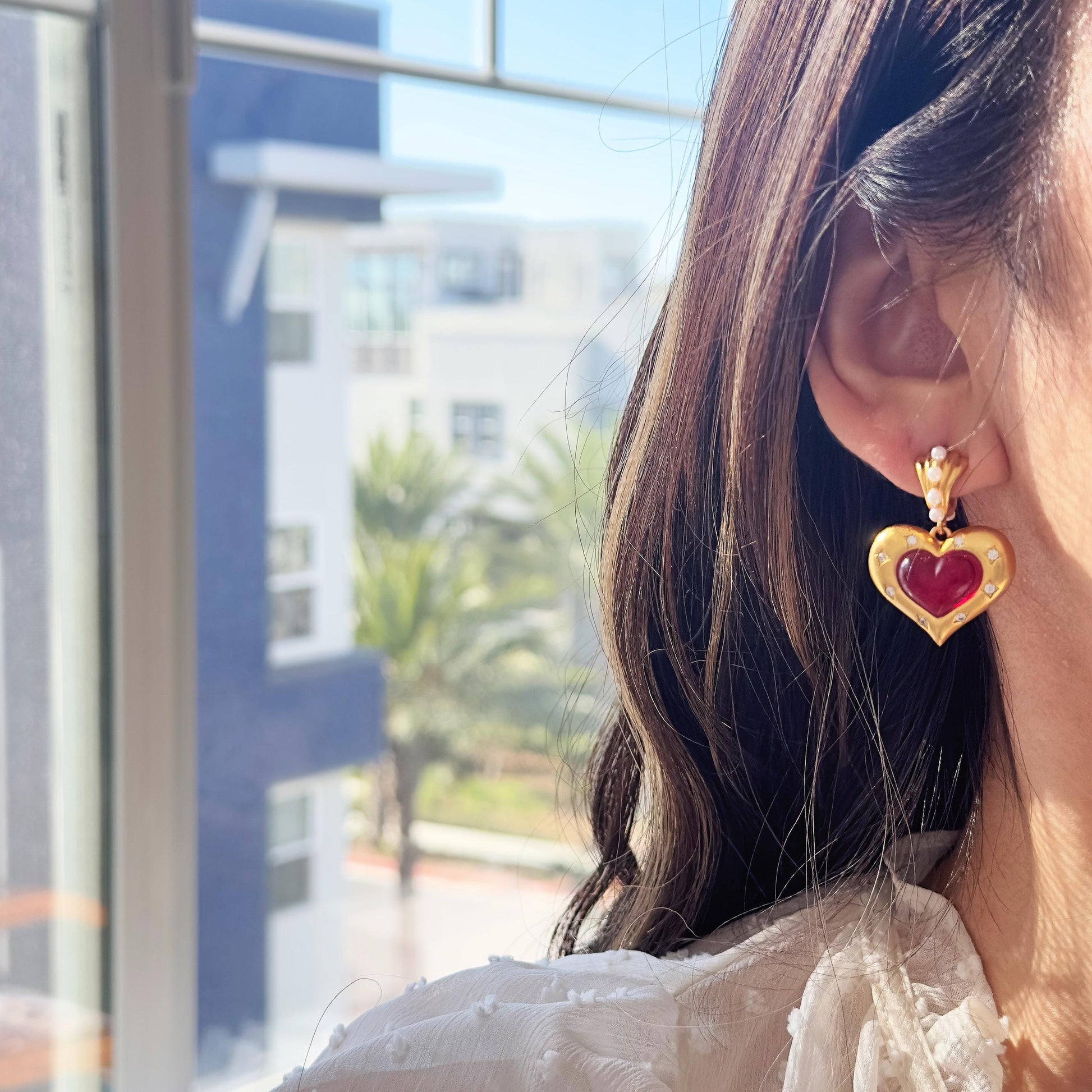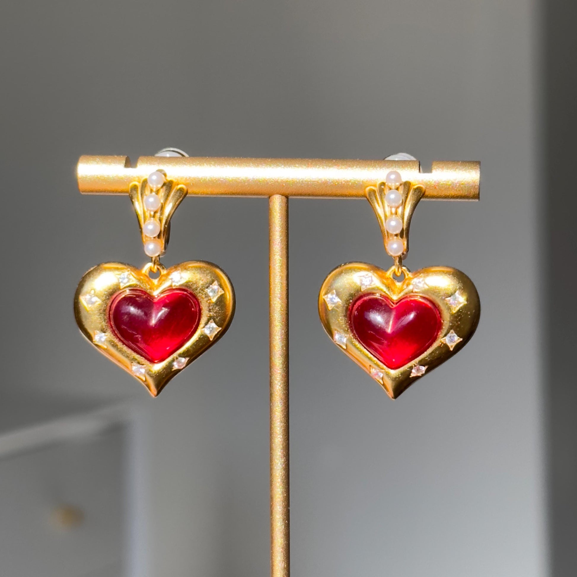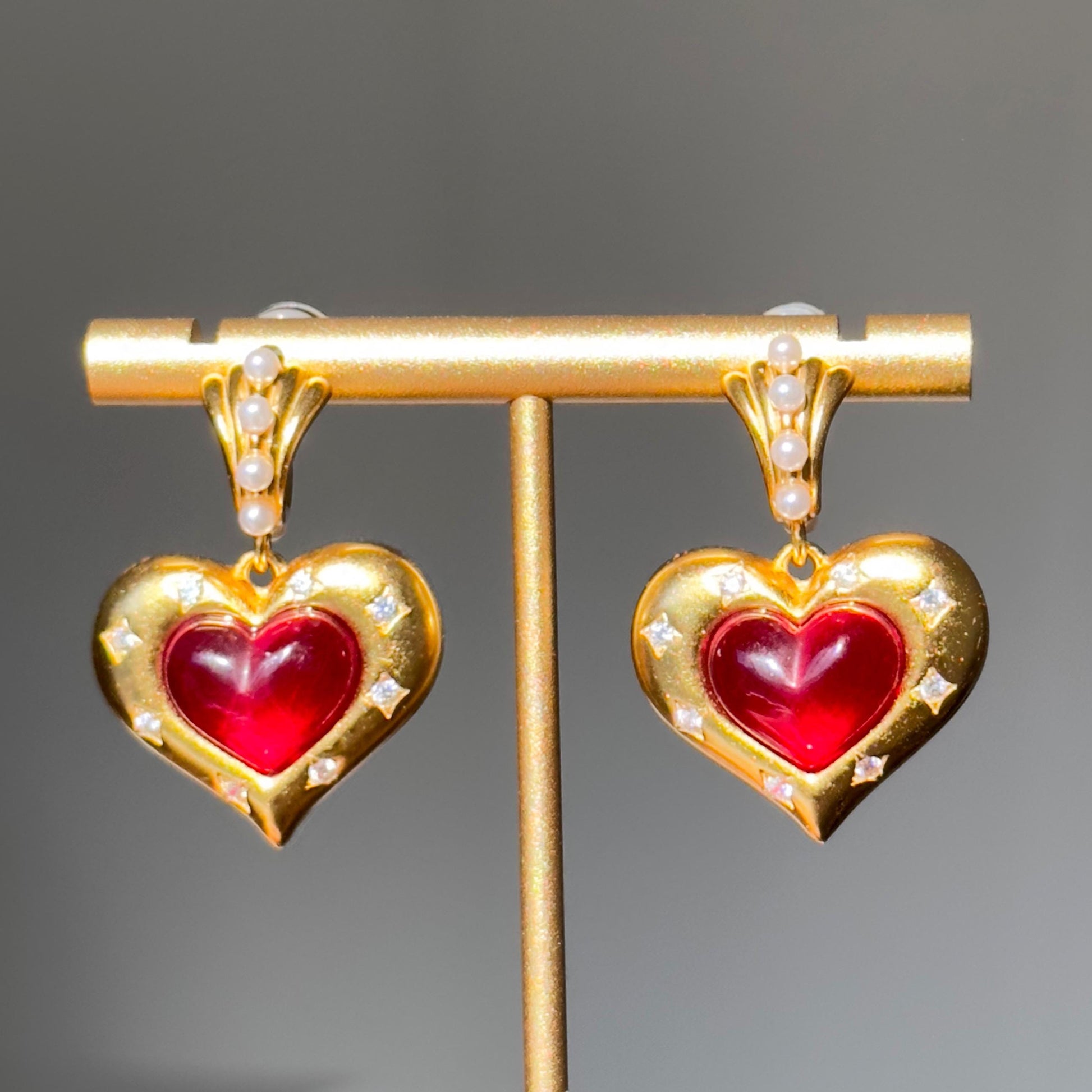 These vintage-inspired heart earrings feature a luxurious 18K gold-plated finish with a radiant red glass centerpiece, surrounded by delicate crystal-like accents for a touch of sparkle. The top is adorned with dainty faux pearls, adding elegance and sophistication to the overall design. Perfect for elevating any outfit, these earrings are versatile enough for both casual wear and formal occasions.