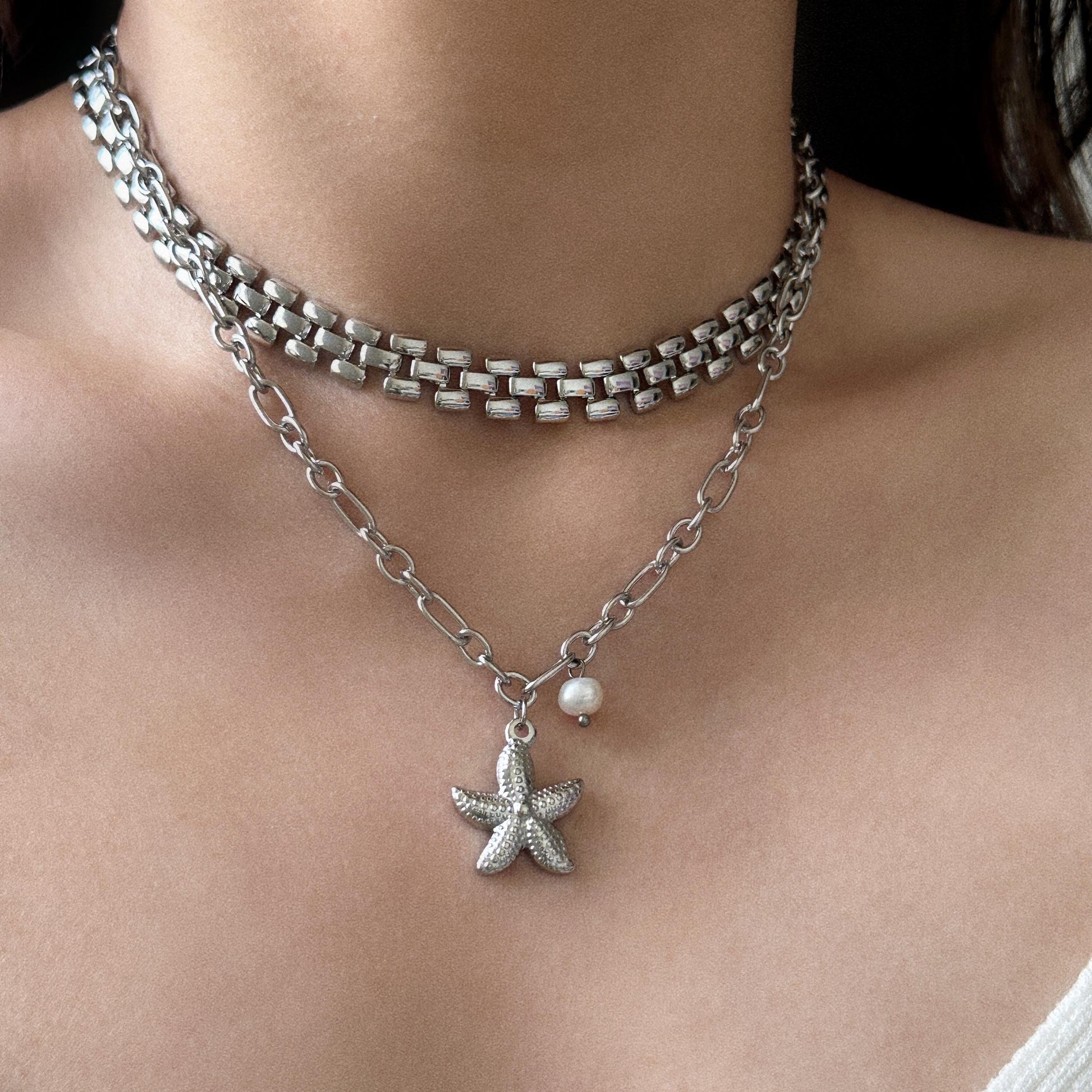Inspired by the sleek design of classic watchbands, this bold chain necklace features a structured, interlocking metal link design that adds a modern, industrial edge to any outfit. It is available in gold and silver finishes, offering durability and a polished, luxurious look.